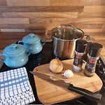 Det finns matplats, tillsammans med mikrovågsugn, vattenkokare och te-/kaffebryggare.